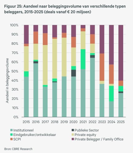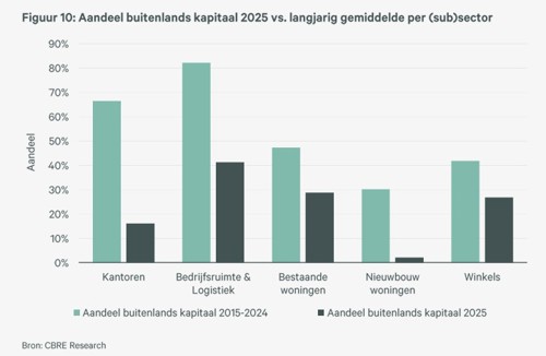 De beleggingsmarkt herstelde in 2025 met een 15% hoger transactievolume ten opzichte van 2024. Dat is beter dan verwacht. De woningbeleggingen vormen hier een substantieel deel van. Te meer daar het buitenlandse kapitaal voor woningbeleggingen in Nederland achterbleef. Dat is onder meer te wijten aan de hoge overdrachtsbelasting voor woningen van 10,4% in 2025, die het rendement voor de kortere termijn investeerders als privateequity-fondsen teveel aantast. Per 1 januari 2026 is die verlaagd naar 8%, wat internationaal gezien nog steeds hoog is . Het waren de private investeerders, family offices en Nederlandse en Franse particuliere fondsen die 52% van het totale aankoopvolume voor hun rekening namen.