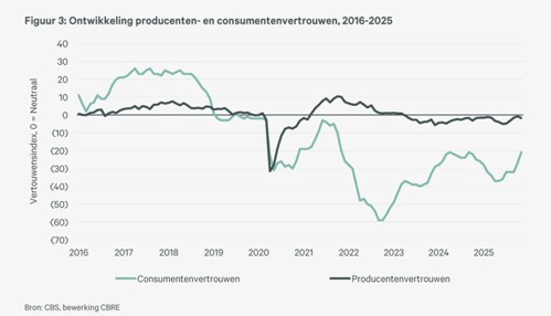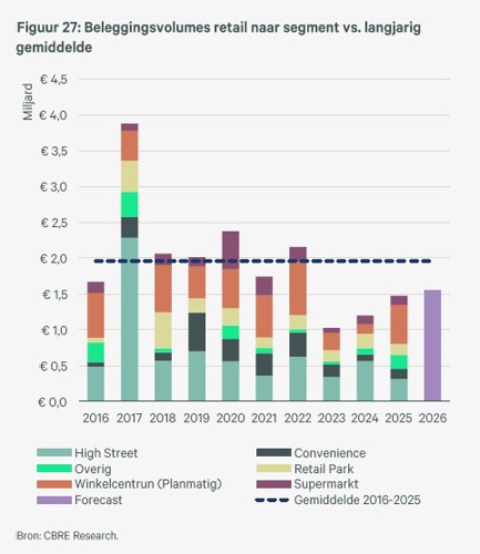 beleggers aan die € 1,5 miljard investeerden in 2025, een plus van 22% ten opzichte van 2024. Voor 2026 wordt een verdere groei tot ca. € 1,6 miljard verwacht. De vraag naar supermarktgedreven wijk-inkelcentra nam duidelijk toe, met de toegenomen vraag naar grote winkelcentra als voorbeeld. Onder meer de Franse fondsen onderzoeken de Nederlandse markt van grote winkelcentra.
