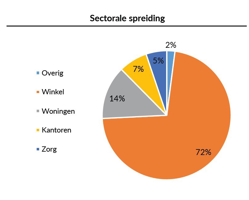 In de volgende grafiek ziet u de procentuele verdeling van de spreiding van de vastgoedportefeuille over de verschillende sectoren vastgoed. De kantorenmarkt in Duitsland laat een gemiddelde leegstand zien van ca. 7,6%, na een stijging in het eerste kwartaal van 2025.