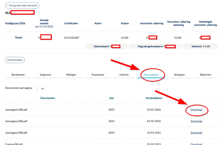 Binnen het contract gaat u naar de tab ‘Documenten’. Hier kunt u uw jaaropgave eenvoudig downloaden.